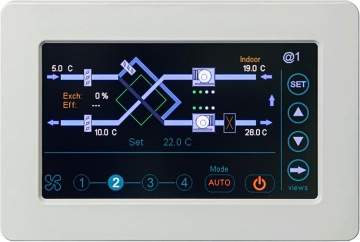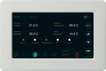 Velikou výhodou moderního ovládacího panelu je jeho základní obrazovka, která obsahuje všechny nejdůležitější informace o vzduchotechnické jednotce a umožňuje přímou editaci žádaných hodnot, jako je teplota, otáčky ventilátoru, pracovní program a zapnutí / vypnutí jednotky, aniž byste museli procházet jiné obrazovky a tyto informace hledat.