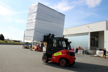 Das Abladen der Ladung von den Schwerlastwagen war nicht einfach, daher wurde ein spezieller Gabelstapler zur Verfügung gestellt, der schwere und hohe Lasten problemlos bewältigen kann. Alles ist gut gegangen, die Fahrer und der Bauleiter konnten endlich aufatmen.