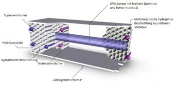 Die aktive RCI-Technologie (Radial Catalytic Ionization) basiert auf den natürlich vorkommenden Prozessen und nutzt die Vorteile der Ionisierungs-Eigenschaften, die sie mit photokatalytischen Reaktionen bestimmter Edelmetalle kombiniert, um einen extrem hohen Wirkungsgrad zu erzielen. Nach dem Einschalten der UV-Anlage trifft die Strahlung die Wabenstruktur der Matrix und löst chemische Prozesse und die Bildung von Superoxid- und Hydroxid-Ionen aus, die die Luft auch außerhalb der Lüftungsanlage und zwar direkt im Raum reinigen.